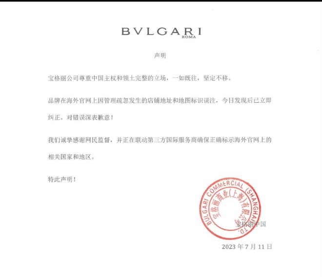 7月11日,寶格麗中國發(fā)布聲明稱:寶格麗公司尊重中國主權和領土完整的立場,一如既往,堅定不移。品牌在海外官網(wǎng)上因管理疏忽發(fā)生的店鋪地址和地圖標識誤注,今日發(fā)現(xiàn)后已立即糾正。對錯誤深表歉意!我們誠摯感謝網(wǎng)民監(jiān)督,并正在聯(lián)動第三方國際服務商確保正確標示海外官網(wǎng)上的相關國家和地區(qū)。