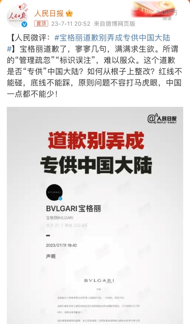 針對這一行為,人民日報發(fā)表評論稱#寶格麗道歉別弄成專供中國大陸#:所謂的“管理疏忽”“標識誤注”,難以服眾。這個道歉是否“專供”中國大陸?如何從根子上整改?紅線不能碰,底線不能踩,原則問題不容打馬虎眼,中國一點都不能少!