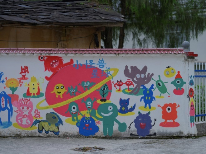 墻繪也是本次公益行動(dòng)中的重頭戲。在這些藝術(shù)課程開展的前一天,孩子們在美術(shù)老師的指導(dǎo)下,在教學(xué)樓后的一面空墻畫出自己心目中的小怪獸,組成一面小怪獸星球墻。三年級的小袁穿著粉白衣裙,與其他上色迅速但略顯粗糙的孩子不同,她慢工出細(xì)活,不緊不慢地用刷子畫出了一只造型奇趣、有著兩只不同觸角的綠色小怪獸,光是后期的修飾也花了不少時(shí)間。完工之后,她站在墻邊,滿意地看著自己的怪獸。