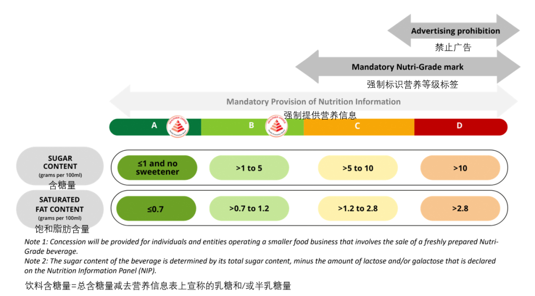 被列為C級(jí)、D級(jí)的營(yíng)養(yǎng)級(jí)飲料必須在包裝正面貼上Nutri-Grade標(biāo)簽,A級(jí)、B級(jí)的營(yíng)養(yǎng)級(jí)飲料則可以選擇是否貼上標(biāo)簽。其中,D級(jí)飲料不得在所有媒體平臺(tái)上做廣告宣傳。