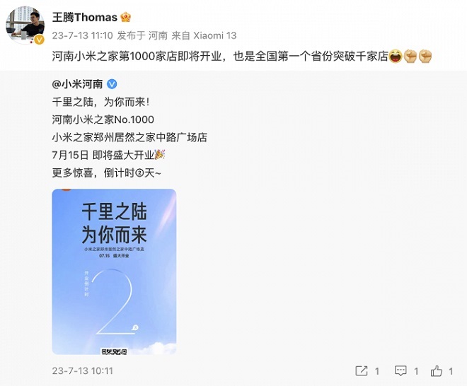 7月13日,小米河南宣布,河南小米之家第1000家店——小米之家鄭州居然之家中路廣場店將于7月15日開業(yè)。