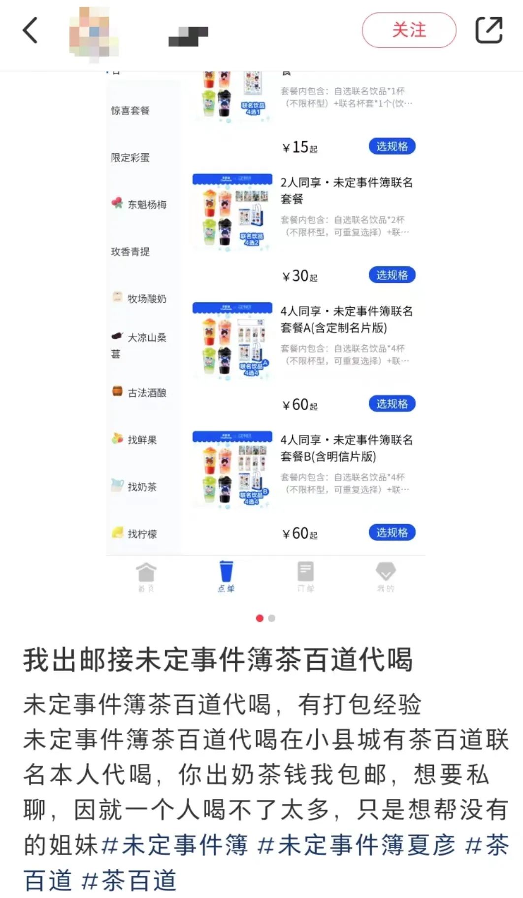 北京多家門店因為聯(lián)名商品訂單太多,不得已先在外賣渠道下架聯(lián)名套餐。刺猬公社致電海淀區(qū)另一家茶百道門店時,店主稱因物料所剩不多,已暫停外賣接單,線下門店還有少數(shù)物料可供出售。對話過程宛若暗號,只需要詢問“那個還有嗎”,店家就能明白來電者問的是周邊。