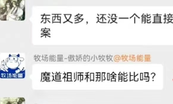 起初是有粉絲發(fā)現(xiàn),有牧場能量店員在工作群中發(fā)表貶低《魔道祖師》的言論。根據(jù)網(wǎng)絡(luò)流傳截圖顯示,有店員在群里稱:“魔道祖師和那啥能比嗎?”