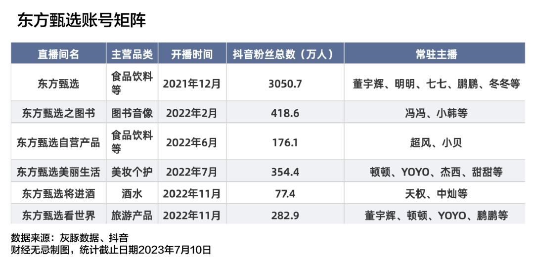 為減輕對董宇輝個人IP的依賴,東方甄選孵化了YOYO、頓頓、七七、明明、杰西、大琪、甜甜、大琪等40多人的主播團(tuán)隊。同時開辟了包括東方甄選之圖書、東方甄選看世界、東方甄選美麗生活、東方甄選自營產(chǎn)品、東方甄選將進(jìn)酒5個垂直賬號,覆蓋食品飲料、生鮮水果、圖書、美妝個護(hù)、旅游等品類,形成了特色化的品牌矩陣。
