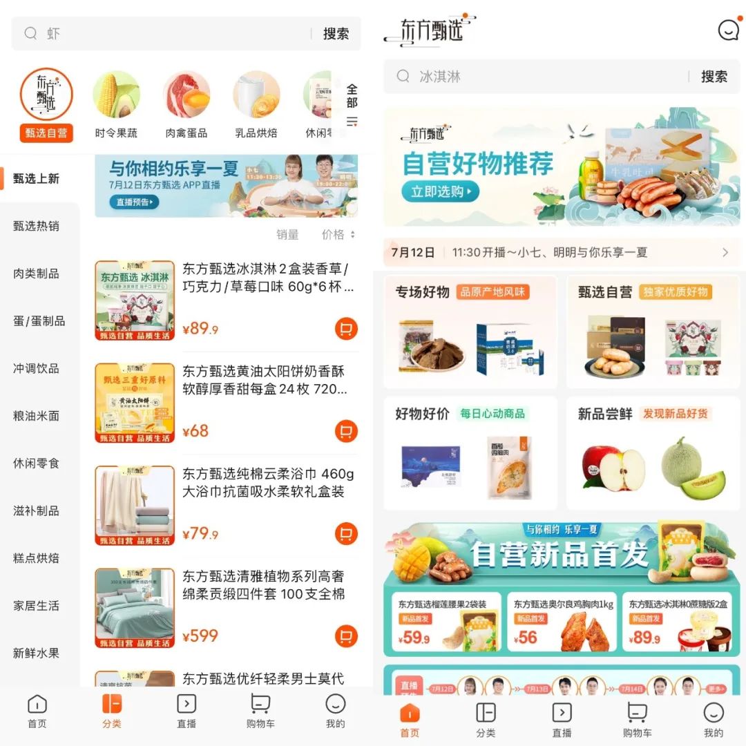 東方甄選將直播專場預(yù)告作為引流入口, 自營新品位于展示頁前列