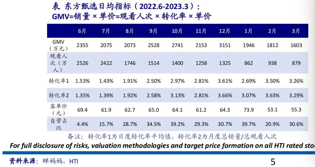 而從去年6月場觀突破600萬人后,東方甄選的數(shù)據(jù)也呈現(xiàn)明顯的下滑趨勢。根據(jù)海通證券研報的具體統(tǒng)計,2022年6月至2023年3月,東方甄選的場觀表現(xiàn)、日均GMV、觀看人次均出現(xiàn)明顯下滑。