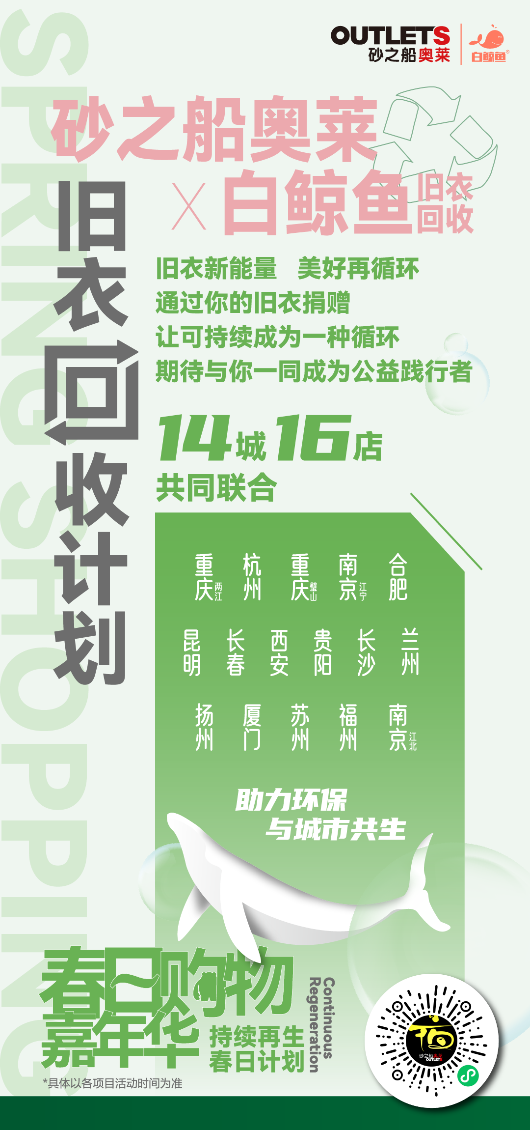 從活動(dòng)規(guī)模上看,砂之船14城16店聯(lián)手支付寶官方城市服務(wù)合作商舊物回收平臺(tái)白鯨魚(yú)共同開(kāi)展「舊衣回收」計(jì)劃,從3月到6月,用3個(gè)月的時(shí)間開(kāi)展了一場(chǎng)周期長(zhǎng)、參與廣、活動(dòng)多元的「綠色循環(huán)」活動(dòng),鏈接商場(chǎng)商戶(hù)品牌和顧客積極參與,通過(guò)「舊物循環(huán)」延長(zhǎng)物品的「生命周期」,讓物品本身「可持續(xù)發(fā)展」,倡導(dǎo)綠色環(huán)保理念。