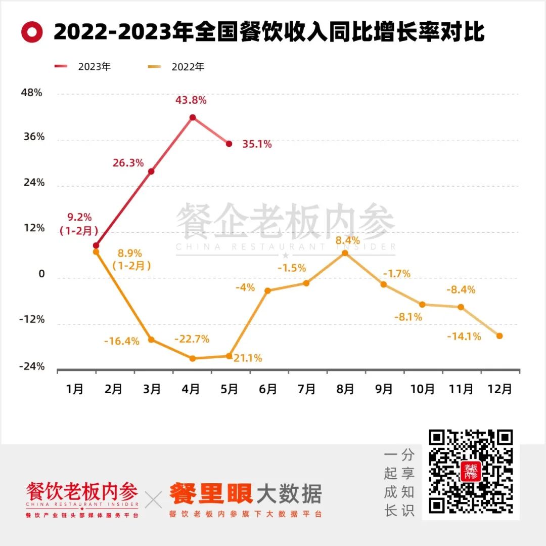 這種“火熱勢(shì)頭”體現(xiàn)在消費(fèi)市場(chǎng)上:根據(jù)國(guó)家統(tǒng)計(jì)局?jǐn)?shù)據(jù)顯示,2023年1-5月份,全國(guó)餐飲收入達(dá)到19958億元,增長(zhǎng)22.6%。