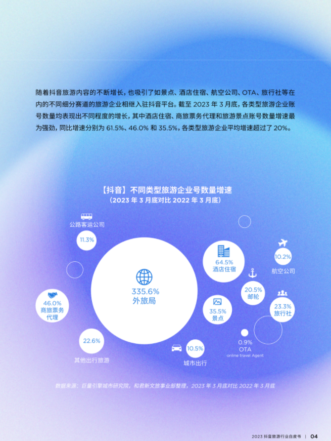 《2023抖音旅游行業(yè)白皮書(shū)》顯示,截至今年3月底,抖音上景點(diǎn)、酒店住宿、航空公司、OTA、旅行社等各類(lèi)旅游企業(yè)賬號(hào)數(shù)量的平均增速超過(guò)了20%,其中酒店住宿、商旅票務(wù)的賬號(hào)數(shù)量的增速高達(dá)61.5%、46.0%。