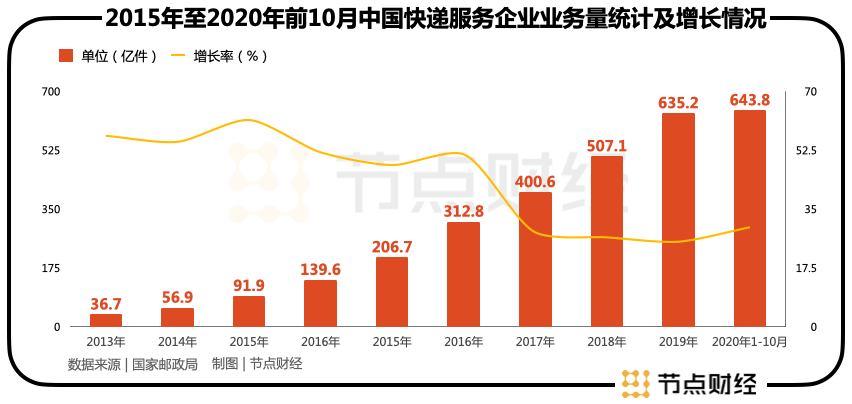 國(guó)家郵政局?jǐn)?shù)據(jù)顯示,2017年之前,中國(guó)快遞行業(yè)業(yè)務(wù)總量增速大致在50%-60%這一區(qū)間。2017年這一數(shù)據(jù)便急轉(zhuǎn)直下降低至28.1%,此后增速維持在20%以上,再難回到2017年前的高速增長(zhǎng)時(shí)代。