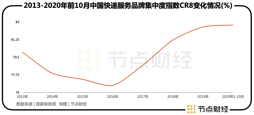 在極兔選擇回到國(guó)內(nèi)市場(chǎng)時(shí),快遞行業(yè)的競(jìng)爭(zhēng)格局已經(jīng)相對(duì)穩(wěn)固。國(guó)家郵政局?jǐn)?shù)據(jù)顯示,國(guó)內(nèi)快遞行業(yè)的品牌集中度自2016年后便不斷攀升。經(jīng)過多年的行業(yè)出清,截至2020年前10月,中國(guó)快遞服務(wù)品牌集中度指數(shù)CR8達(dá)到82.7%。
