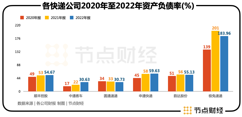 另一廂,極兔自身快遞業(yè)務(wù)依然在持續(xù)虧損中,其資產(chǎn)負(fù)債率也遠(yuǎn)高于同行。2020年至2022年,極兔的資產(chǎn)負(fù)債率分別為138.83%、201.39%和183.96%。對(duì)比之下,三通一達(dá)以及順豐近三年的資產(chǎn)負(fù)債率不超過60%。