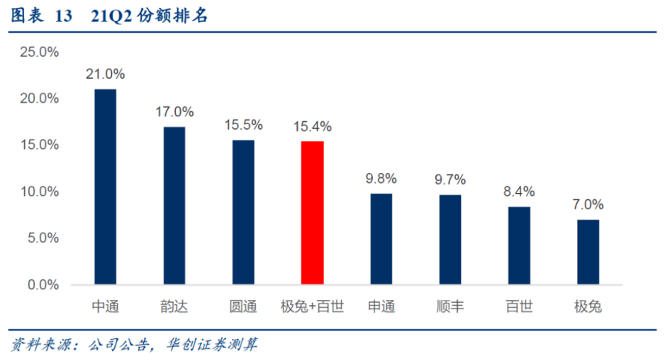2021年10月,極兔官宣了一項(xiàng)震驚國(guó)內(nèi)快遞圈的并購(gòu),以11億美元(約合人民幣68億元)收購(gòu)當(dāng)時(shí)市場(chǎng)份額僅次于“三通一達(dá)”和順豐的百世快遞。華創(chuàng)證券曾測(cè)算,若以2021年Q2各家快遞市場(chǎng)份額預(yù)估,極兔收購(gòu)百世后,二者市場(chǎng)份額相加能夠達(dá)到15.4%,僅次于中通、韻達(dá)和圓通。