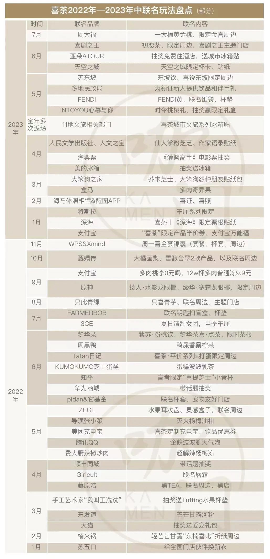 我梳理了2022年以來喜茶的聯(lián)名上新,發(fā)現(xiàn)從今年開始,量級、影響力、數(shù)量,都在提升,除了Fendi、甄嬛傳、喜劇之王、美的冰箱,還有11城文旅局,幾乎囊括了年輕人的衣食住行。
