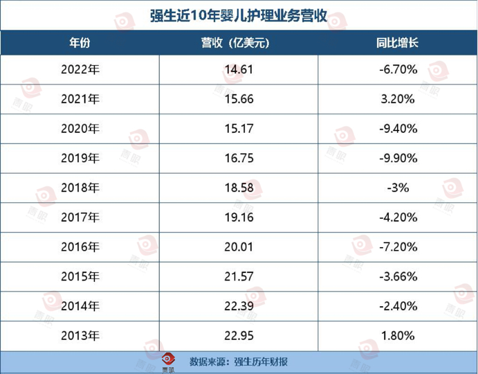 此外,就近三年來看,嬰兒護(hù)理業(yè)務(wù)占強(qiáng)生健康消費(fèi)品部門總營收的比重也在逐年下滑。據(jù)Kenvue招股書顯示,截止2022年末,嬰兒護(hù)理占總營收比重僅為10%,而在十年前該比例為15%。