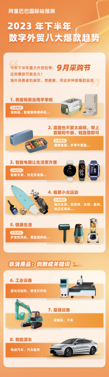 與此同時,在2023數(shù)字外貿(mào)半年報中,阿里國際站還預(yù)測了下半年最大外貿(mào)旺季9月采購節(jié)的8大爆款,除了新能源、電動汽車等“新三樣”外,還有柔性定制打印機、激光切割機、挖掘機等具有更高科技含量的機械設(shè)備正在或即將進入高增長周期。