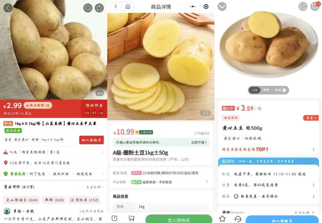在上海地區(qū),作者發(fā)現(xiàn),以產(chǎn)區(qū)為山東的土豆為例,多多買菜的售價為2.99元/1000克、盒馬是3.59元/500克;百果園上的售價則為10.99元/1000克。