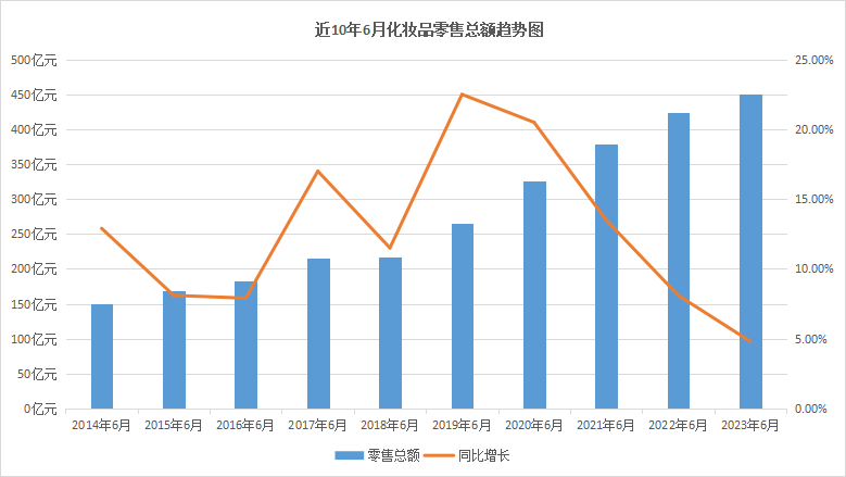 不過(guò),從今年上半年總體增速來(lái)看,今年6月整體增速并不及前兩個(gè)月的表現(xiàn)。尤其是今年4月,化妝品零售總額實(shí)現(xiàn)了24.3%的高額漲幅,這也是2022年負(fù)增長(zhǎng)后的一次超強(qiáng)勢(shì)復(fù)蘇。但自4月以后,化妝品零售總額增幅開(kāi)始逐步放緩,即便6月有618大促等活動(dòng)加持,但增長(zhǎng)幅度仍持續(xù)縮減至4.8%,僅略高于今年1-2月水平。