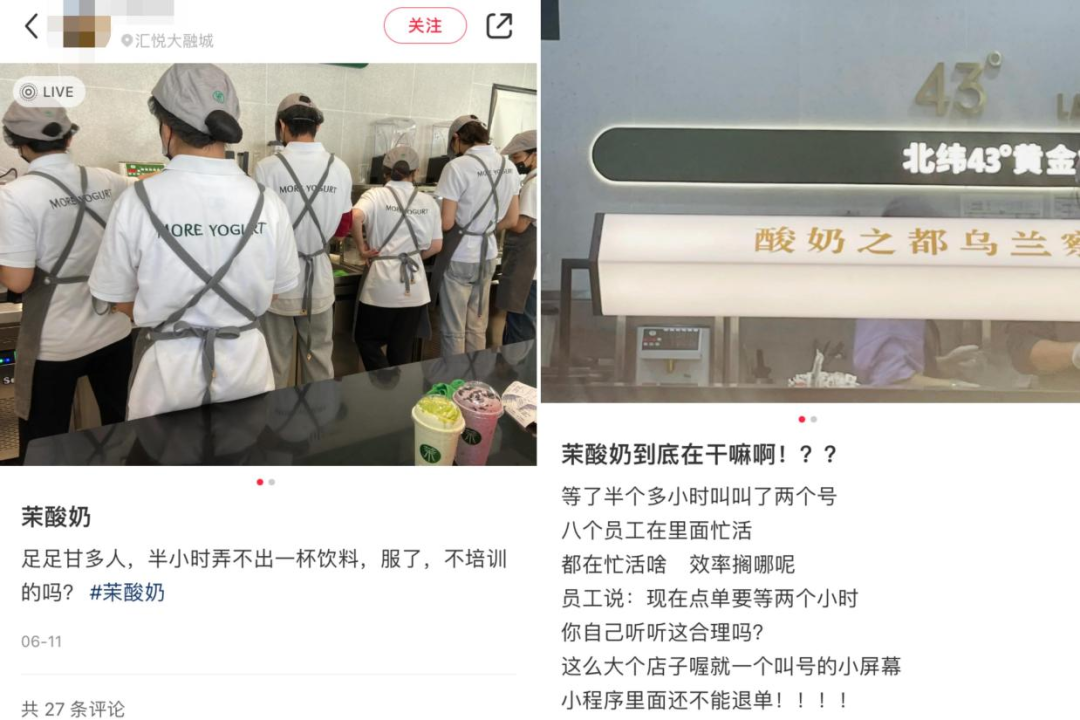 其次,茉酸奶店內(nèi)人員配置過多但缺乏效率,部分30㎡的標(biāo)準(zhǔn)店也設(shè)置了6-8名員工,但據(jù)消費(fèi)者反映出品速度依然很慢。