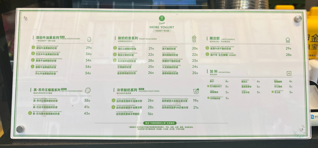 筆者走訪上海一茉酸奶門店發(fā)現(xiàn),僅“酸奶+水果+堅果/小料”的組合便能賣到20元以上,牛油果、蘇丹王榴蓮系列產(chǎn)品更是超過了30元、40元。
