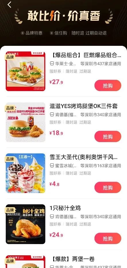 “敢比價(jià)”覆蓋了肯德基、華萊士、茶百道等眾多大型連鎖品牌,官方補(bǔ)貼額度在1-850元區(qū)間,其中部分商品的官方補(bǔ)貼額度能達(dá)到500元以上,支持全網(wǎng)比價(jià)。