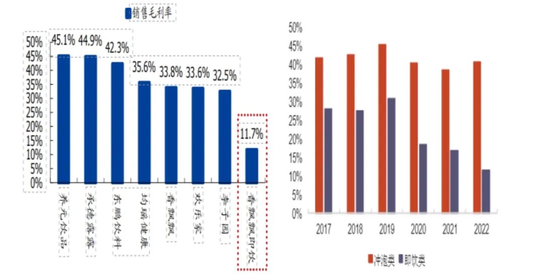 一方面,相比傳統(tǒng)的優(yōu)勢業(yè)務,即飲業(yè)務目前并沒有形成明顯的規(guī)模效應,也就意味著目前即飲根本無法攤薄折舊、人工、材料和制造成本,導致其毛利率遠低于同期的沖泡業(yè)務。根據(jù)財務數(shù)據(jù),2022年公司即飲業(yè)務的毛利率僅為11.7%不僅在行業(yè)中處于較低水平,而且也遠低于同期沖泡類40%左右的毛利率。