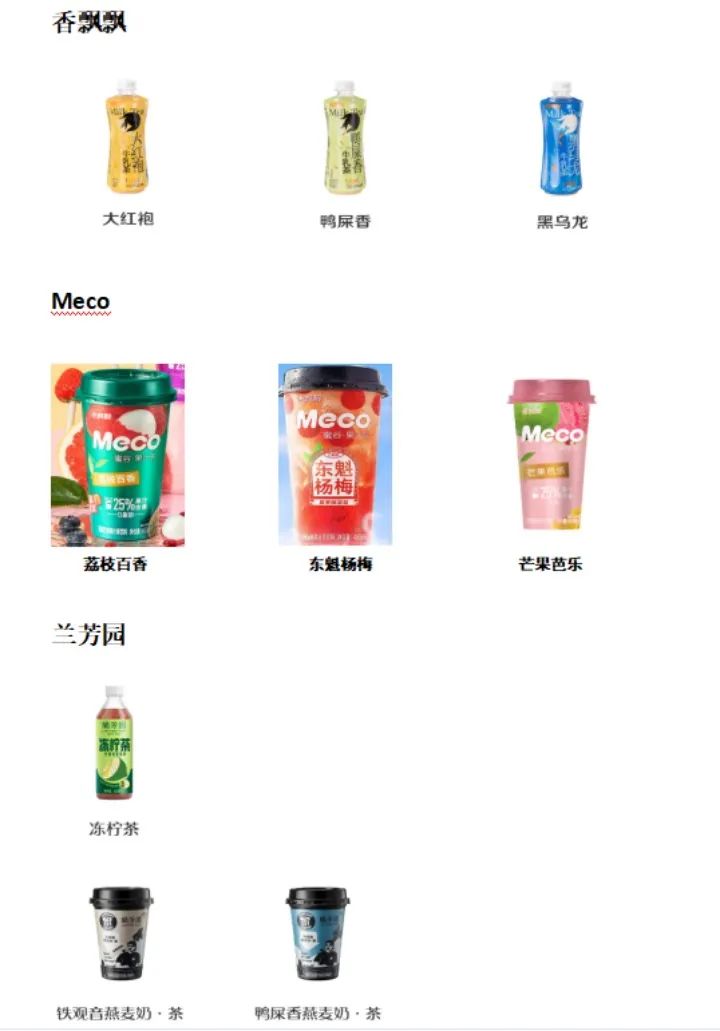 具體來看,香飄飄主品牌下,推出了瓶裝牛乳茶,包括黑烏龍、大紅袍和鴨屎香三個口味;Meco品牌下推出了荔枝百香、芒果芭樂和夏日限定的東魁楊梅新口味;蘭芳園品牌下推出了瓶裝凍檸茶以及和OATLY聯(lián)名的燕麥奶產(chǎn)品。
