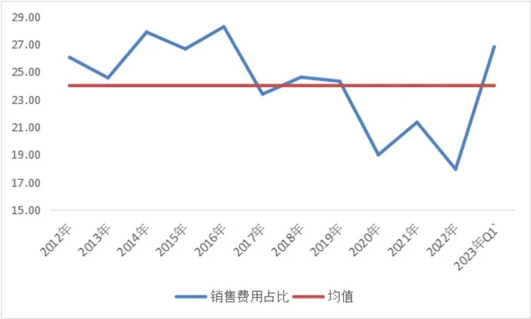 最后,從營銷推廣方面看,眾所周知,香飄飄向來舍得在營銷上投入,銷售費用占比長期在20%以上,2023年Q1更是高達26.8%,其中廣告代言費上市以來占比均值高達10%以上。