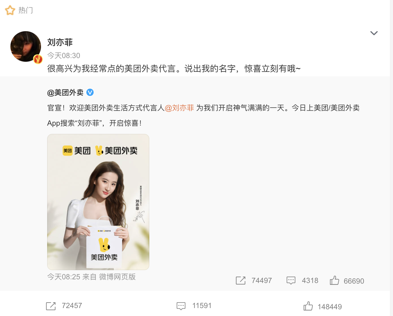 聯(lián)商快訊:7月18日,美團(tuán)外賣官宣劉亦菲為品牌代言人。劉亦菲轉(zhuǎn)發(fā)并發(fā)文稱,“很高興為我經(jīng)常點(diǎn)的美團(tuán)外賣代言。說出我的名字,驚喜立刻有哦~”。