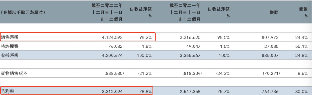2022年普拉達(dá)集團(tuán)全年銷售收入大漲24.8%至42億歐元,凈利潤(rùn)大漲58.1%至4.65億歐元。集團(tuán)毛利率上升至78.8%,是其2011年港交所上市后,毛利率最高的一年。