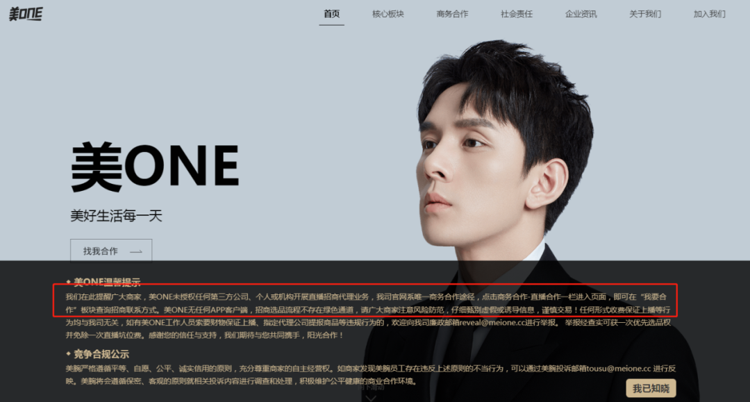 今日,青眼點(diǎn)進(jìn)美ONE公司官網(wǎng)發(fā)現(xiàn),其官網(wǎng)首頁(yè)設(shè)有“溫馨提示”,表示“美ONE未授權(quán)任何第三方公司、個(gè)人或機(jī)構(gòu)開(kāi)展直播招商代理業(yè)務(wù),我司官網(wǎng)系唯一商務(wù)合作途徑”。