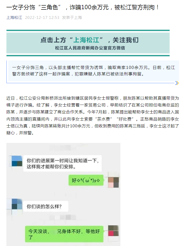 比如去年7月,上海市松江區(qū)人民政府官方公眾號(hào)同樣公布了一起案件,被告人陳某稱能幫助受害人李女士的商品進(jìn)入國(guó)內(nèi)頂流主播的直播間內(nèi),并以此向李女士索要“茶水費(fèi)”“好處費(fèi)”共計(jì)100余萬(wàn)元。