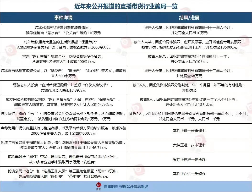 青眼不完全梳理發(fā)現(xiàn),近年來(lái)直播帶貨領(lǐng)域的騙局層出不窮,已然成為了新型犯罪的“高發(fā)區(qū)”。