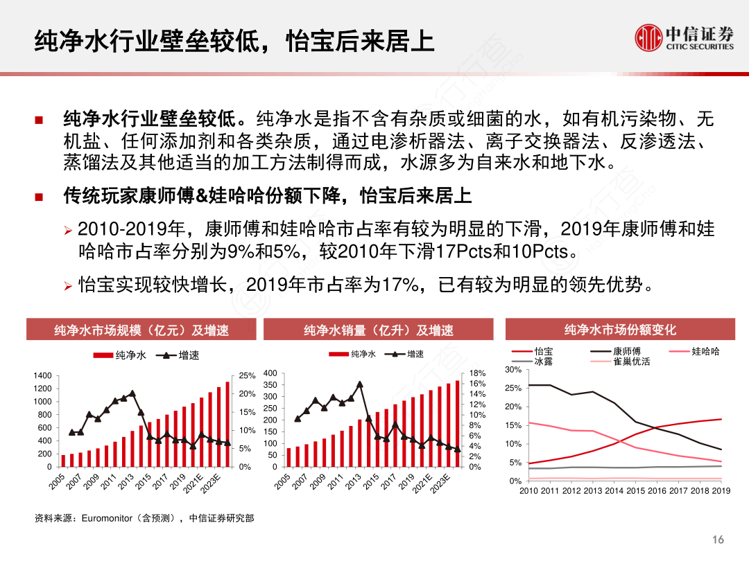 在經(jīng)歷股份與經(jīng)營主體多次更迭后,2004年,怡寶明確了自身品牌定位——要做全國專業(yè)化的飲用水公司。自此,怡寶的業(yè)務(wù)規(guī)模不斷擴(kuò)大,市占率不斷提高,逐漸在飲用水市場站穩(wěn)腳跟。