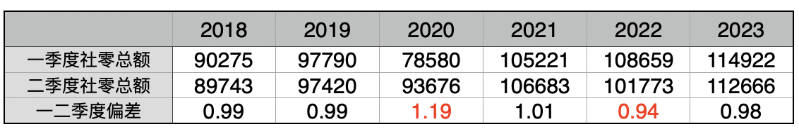 今年第一季度的社零總額為11.5萬億元,第二季度的社零總額為11.3萬億元。雖然第二季度較第一季度的數(shù)據(jù)略有下降,但兩者相差并不大。類似的情況均發(fā)生在疫情之前的2018年和2019年。2018年的第一和第二季度的社零總額先后為9.3和9.0億萬元;2019年第一和第二季度的社零總額先后為9.8和9.7億萬億元?梢娂词乖谡D攴荩诙径鹊陀诘谝患径纫彩浅S械氖虑。表1列出了2018年到2023的上半年的第一季度和第二季度社零總額的數(shù)據(jù)對比,其中2021年作為在疫情期間經(jīng)濟恢復較好的年份,第二季度和第一季度的數(shù)據(jù)幾乎持平。但是2020年和2022年的第二季度相較于第一季度的大幅的上下偏差則都是因為新冠疫情的不同影響,因為大家都親歷其中原因也很好解釋。