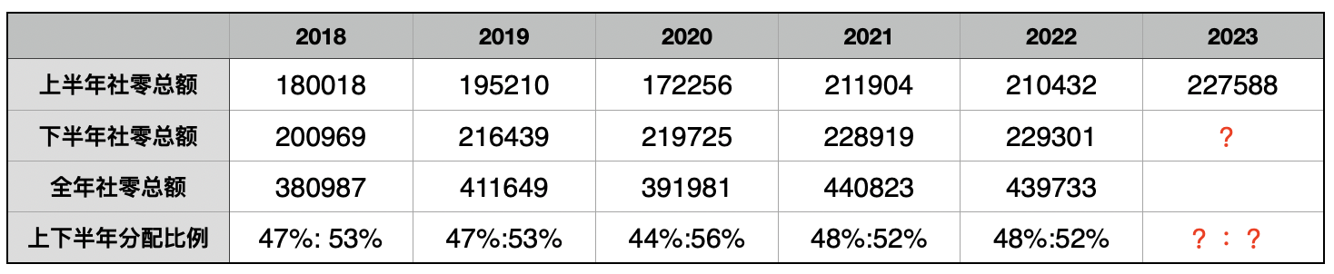 由表2可見,自2018年以來到現(xiàn)在,即使在最困難和最不穩(wěn)定的時期,下半年的社零總額都從沒有低過上半年的數(shù)據(jù)。而且近兩年的上下半年的比例分配都在48%到52%之間。2020年初因為爆發(fā)在武漢的疫情和后來的強勁反彈使這個比例進一步放大但屬于特例。所以,如果以今年上半年的22.8萬億元除以48%,則2023全年的社零總額可望達到47.5萬億元;如果除以正常年份的47%,甚至還可以上看48.5萬億元。但是考慮到目前的經(jīng)濟環(huán)境,我們還不敢如此樂觀。我們可以從公布的22.8萬億元的細分中了解到建筑與裝潢材料,辦公用品這兩項消費下降明顯,不禁令人想到了房地產(chǎn)市場的低位調(diào)整和疫情驅(qū)使的辦公樓出租率的下降。