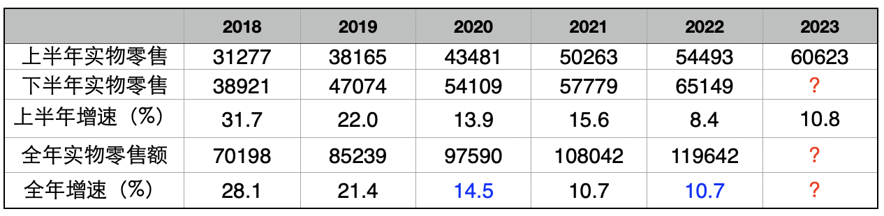 表3 2018-2023年半年和全年實物電商銷售額及增速變化(單位:億元)