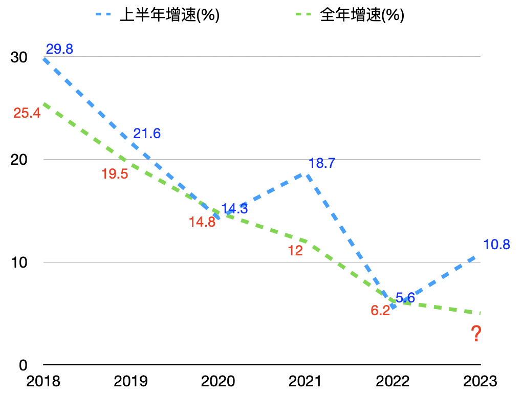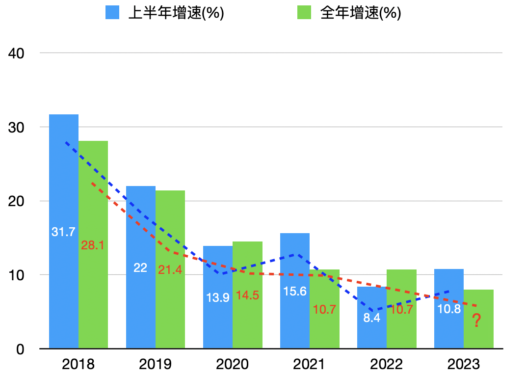 圖2 2018-2023上半年和全年的電商增速變化對比