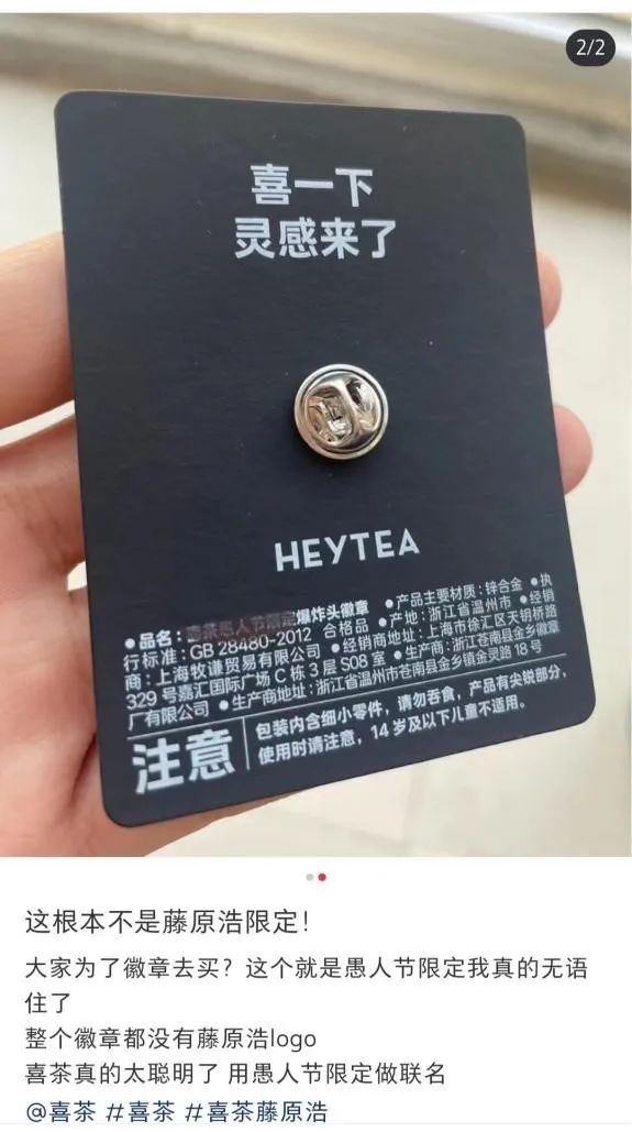 不僅如此,聯(lián)名也成為很多品牌處理囤貨的方式之一,甚至連周邊都還殘留著之前的痕跡。比如當(dāng)時喜茶和藤原浩的聯(lián)名剛推出,就有網(wǎng)友發(fā)現(xiàn),在同步推出的限量徽章上印著的是“愚人節(jié)”,被質(zhì)疑喜茶是把愚人節(jié)的囤貨重新拿出來做聯(lián)名周邊。
