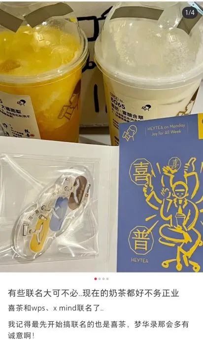 而且剁主觀察發(fā)現(xiàn),如今很多聯(lián)名款都是限時售賣,隨著合作的結(jié)束聯(lián)名款也會下架。因為在這種高密的聯(lián)名合作下,推新品并不是品牌聯(lián)名的核心,產(chǎn)品包裝、周邊設(shè)計反而是茶飲品牌們更在意的。甚至有人調(diào)侃“現(xiàn)在很多茶飲品牌實際上都是周邊公司!