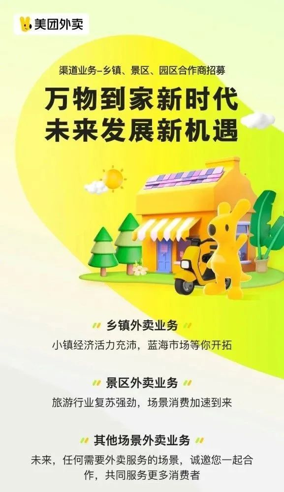 與此同時,在新玩家們還在開拓一二線城市的外賣業(yè)務時,美團也進行錯位競爭,加大對鄉(xiāng)鎮(zhèn)、景區(qū)等外賣空白區(qū)域的布局,想要搶占市場先機,從而鞏固自己的市場份額。