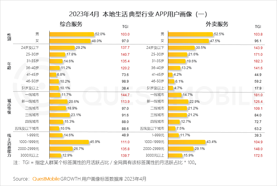 QuestMobile數(shù)據(jù)顯示,2023年4月,外賣服務全網(wǎng)滲透率15.6%,用戶以一線、新一線發(fā)達城市年輕群體為主,在下沉市場及40歲以上人群中滲透率較低。