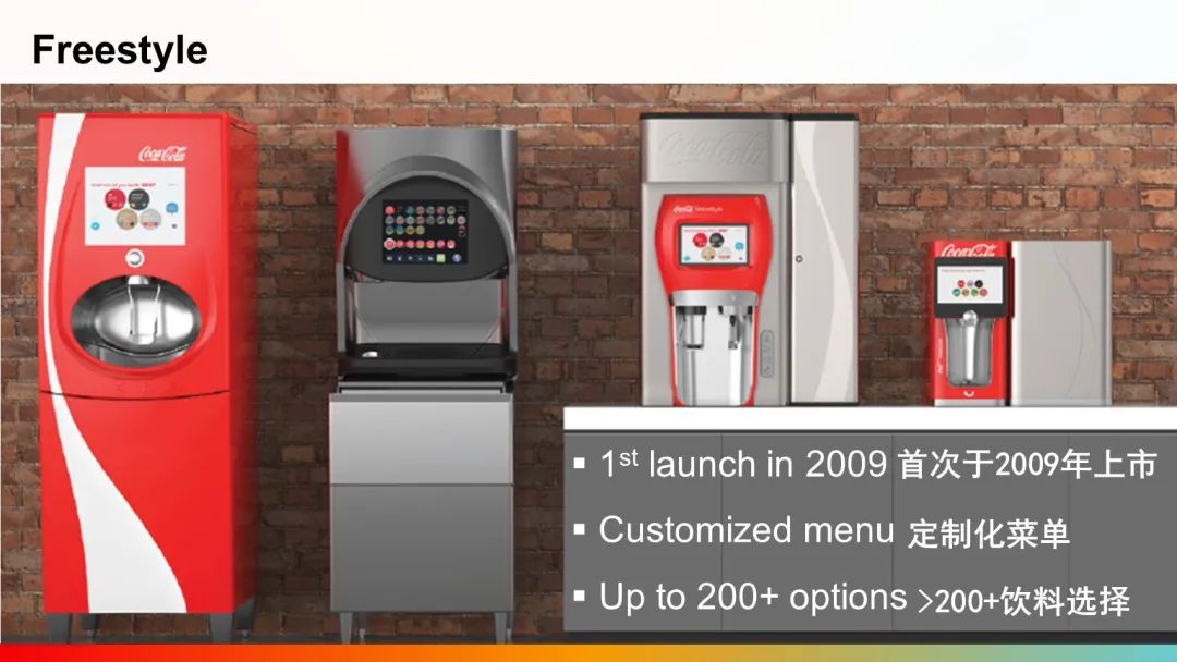 這是我們在北美首推的Freestyle售賣機。首先,F(xiàn)reestyle可以定制化菜單,它可以提供30-200種的不同組合,消費者站在機器前面通過有趣的互動界面可以選擇單一的傳統(tǒng)飲料,也可以按照當時的心情和想法,任意調(diào)配一款飲料。在這個過程中,我們也融入了很多高科技來保證質(zhì)量和產(chǎn)品的口味。