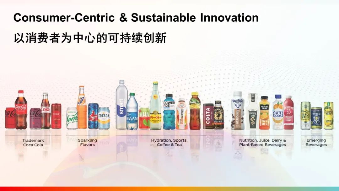 這里展示的是可口可樂在全球目前生產(chǎn)銷售的五大品類,包括傳統(tǒng)的經(jīng)典汽水飲料,也包括低糖、零糖等一些非常受消費者喜愛的產(chǎn)品,同時我們也將茶、水、果汁、乳飲料、植物基飲料以及含酒精的飲料帶給更多的人。