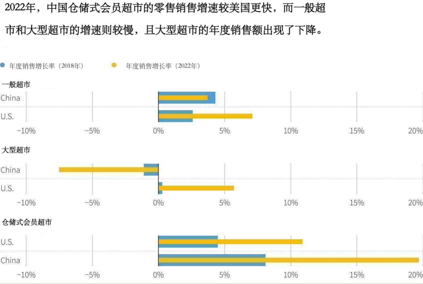 然而,中國的倉儲式會員超市在食雜購買領(lǐng)域僅占銷售額的0.3%,遠遠低于美國的11%。這表明在中國市場仍有很大的增長空間。