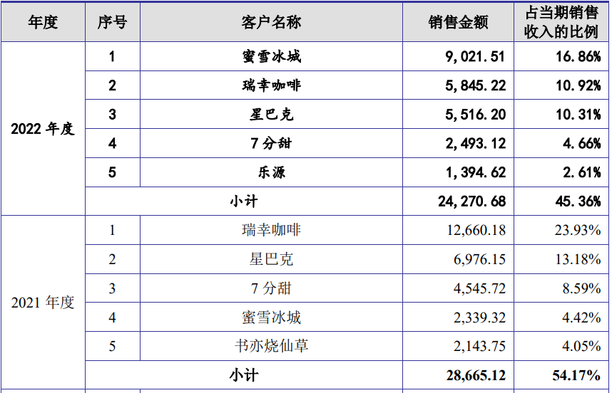 >>>德馨食品在前文中提到,2021年度最大的客戶為瑞幸,其占比23.93%,前5大客戶的收入占比為45.36%,到了2022年,瑞幸在其銷售占比便下降為10.92%,降幅達一倍有余。