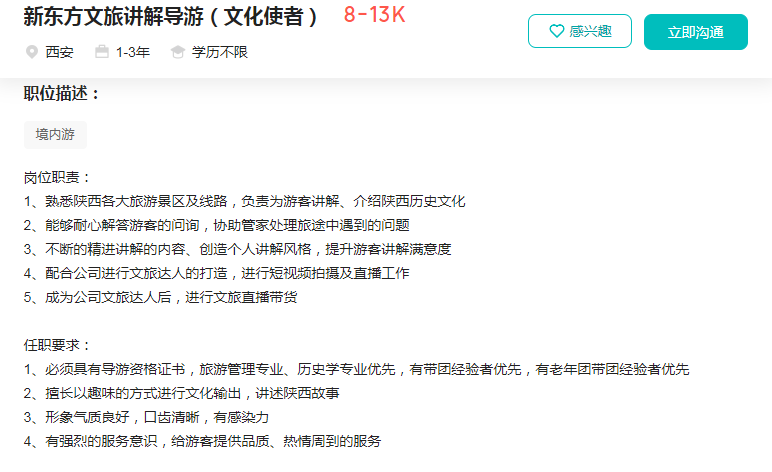 以某招聘網站上發(fā)布的“文旅講解導游”一職為例,該崗位工作地點位于陜西,工作職責包括熟悉陜西各大旅游景區(qū)及線路,為游客講解、介紹陜西歷史文化;不斷精進講解內容、創(chuàng)造個人講解風格;配合公司進行文旅達人的打造,進行文旅直播帶貨等。任職資格則必須具有導游資格證書,旅游管理專業(yè)、歷史學專業(yè)優(yōu)先,有老年團帶團經驗者優(yōu)先,薪資水平為8000-13000元/月。