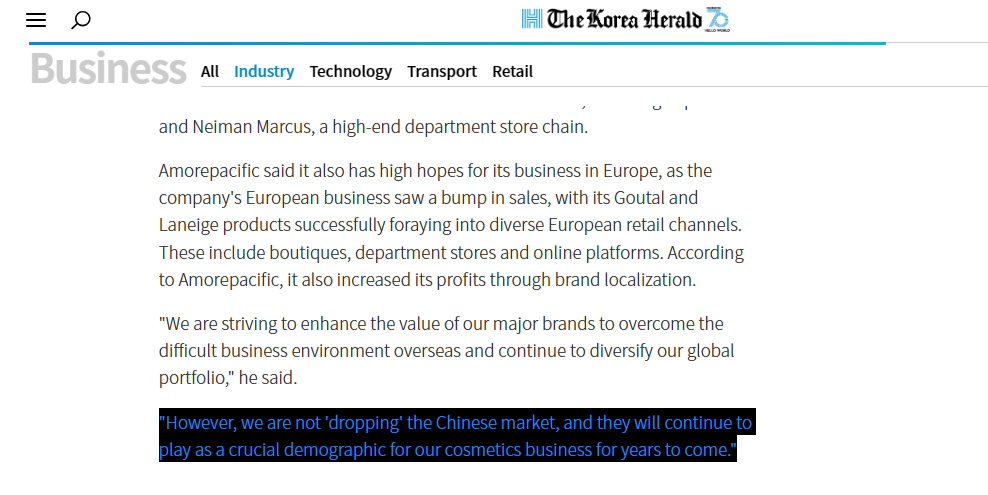 一位愛茉莉太平洋集團(tuán)內(nèi)部人士接受《韓國(guó)先驅(qū)報(bào)》的采訪時(shí)也表示:“我們并沒有‘放棄’中國(guó)市場(chǎng),在未來幾年里,他們將繼續(xù)成為我們化妝品業(yè)務(wù)的關(guān)鍵客戶群!