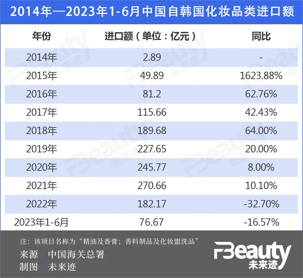 除開韓國(guó)“本土”,一直以來,中國(guó)都長(zhǎng)期占據(jù)著韓妝幾大集團(tuán)海外市場(chǎng)第一的位置。根據(jù)中國(guó)海關(guān)總署發(fā)布的進(jìn)口數(shù)據(jù),中國(guó)自韓國(guó)的化妝品進(jìn)口同比增速,在2015年竟高達(dá)1623.88%的峰值,此后增速有所放緩,2022年更是出現(xiàn)32.70%的負(fù)值,韓妝進(jìn)口持續(xù)遇冷。