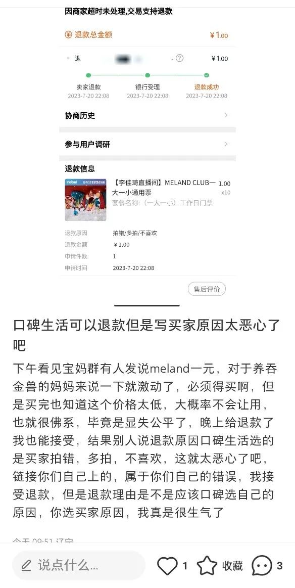 商家推給李佳琦,李佳琦推給下單店鋪,也就是口碑生活,三方都在互相踢皮球。